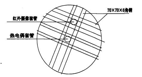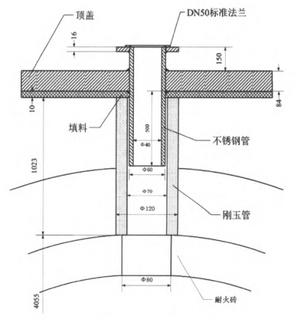 1)提前準(zhǔn)備施工必備的工器具,強(qiáng)制攪拌機(jī)等施工用機(jī)具在設(shè)備運(yùn)至現(xiàn)場(chǎng)前提前試車,保證設(shè)備運(yùn)行完好;2)準(zhǔn)備好施工用材料,在施工前一天將施工所用耐火材料,如耐磨澆注料、輕質(zhì)隔熱料、耐火纖維毯、施工用水等在施工前用吊車將所用材料運(yùn)到熱風(fēng)爐拱頂;3)施工用電鎬等工具準(zhǔn)備確認(rèn)到位;5)施工開始前在熱風(fēng)爐拱頂平臺(tái)下部裝設(shè)安全網(wǎng)。1)由檢修專業(yè)人員打開熱風(fēng)爐拱頂大蓋;2)待打開大蓋后先清理纖維棉,用提前準(zhǔn)備好的纖維散棉將2個(gè)測(cè)溫孔塞住,防止熱風(fēng)竄出傷人;3)開始清理前,首先用鋼釬試探其結(jié)實(shí)程度,根據(jù)原有澆注料的強(qiáng)度來(lái)選用不同的清理方法:a)若原有澆注料易碎、易清理,則選用的清理方法為:采用自制專用鋼釬子搗打拆除,拆除下來(lái)的垃圾大塊及廢磚采用自制的夾子(自制專用夾子長(zhǎng)度2m~3.5m)將廢料夾出放在預(yù)先鋪好的鐵板上,比較散碎的廢料垃圾則利用自制的鐵把加長(zhǎng)的鐵鍬以及L行的刮料鋼板清理。b)如原有澆注料結(jié)塊強(qiáng)度高,則選用的清理方法為:原則上采用電鎬拆除,盡量減少使用次數(shù),在剛開始拆除時(shí)可用,如果澆注料上部清理完后發(fā)現(xiàn)下部結(jié)塊嚴(yán)重時(shí),則增加作業(yè)范圍,先清理下部澆注料外圍保溫磚,再清理結(jié)塊嚴(yán)重的澆注料。因剛玉管長(zhǎng)度1000mm是達(dá)到K磚上層,當(dāng)澆注料清理完至保溫磚部分后就避免使用電鎬。當(dāng)清理完后一層M磚后嚴(yán)禁使用電鎬,防止電鎬槍頭打到K磚上,保護(hù)K磚的結(jié)構(gòu)不受損壞。另外,施工現(xiàn)場(chǎng)是高溫作業(yè),作業(yè)人員分成2批作業(yè),保證施工的連續(xù)性。4)嚴(yán)格按照施工方案進(jìn)行拆除施工,耐材清理完利用風(fēng)管將準(zhǔn)備施工表面進(jìn)行吹掃干凈,清理完成經(jīng)三方確認(rèn)后方可進(jìn)行下道程序。拆除工作結(jié)束前將提前烘烤準(zhǔn)備好的剛玉管運(yùn)至拱頂現(xiàn)場(chǎng),首先在剛玉管內(nèi)用事先準(zhǔn)備好的莫來(lái)石纖維氈用?8mm鐵絲綁牢固放入剛玉管的底部塞住管子,將鐵絲從管子上端牽引出來(lái)。莫來(lái)石纖維氈塞好后,進(jìn)行剛玉管安裝,在熱風(fēng)爐拱頂大蓋開啟前做好標(biāo)記,找好中心線。剛玉管安裝好后,首先,將剛玉管與拱頂磚孔之間的縫隙用莫來(lái)石纖維氈塞嚴(yán),防止陶瓷耐磨料灌人其中;其次,陶瓷耐磨料在澆注前,先檢查紅外攝像孔和熱電偶孔套管中心偏差情況(見圖2),無(wú)誤后再進(jìn)行下步工作;第三,進(jìn)行耐磨澆注料的施工(從K磚算起),將拱頂平臺(tái)上準(zhǔn)備好的陶瓷耐磨料倒人要澆注的部分,每次倒入的耐磨料厚度應(yīng)不低于200mm,邊倒人耐磨料邊用振搗棒振搗施工,保證耐磨料填充密實(shí)。當(dāng)施工到600mm時(shí)改用輕質(zhì)隔熱澆注料繼續(xù)施工400mm,澆注料頂面距離拱頂蓋預(yù)留50mm的間隙,將表面刮平,并用莫來(lái)石纖維毯填平,高出法蘭蓋40mm,法蘭蓋下覆蓋的莫來(lái)石纖維氈壓實(shí)。