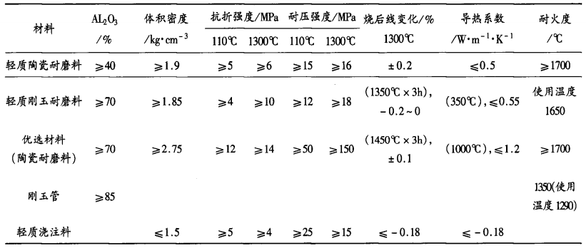 圖1熱風(fēng)爐拱頂結(jié)構(gòu)示意圖3#熱風(fēng)爐拱頂前期先后處理兩次,次處理先清除了斜塌的部分IH磚,用金屬鋼管支模,采用了澆注料進(jìn)行澆注,恢復(fù)了生產(chǎn)。因處理時(shí)深度比較淺,后經(jīng)常發(fā)生熱電偶孔堵塞現(xiàn)象。第二次處理由內(nèi)到外采用了剛玉管+澆注料(下部80%耐磨料+上部20%輕質(zhì)料)。剛玉管底端與拱頂K質(zhì)磚之間加墊了16mm的PMF材料,第二次處理后時(shí)間僅過(guò)3個(gè)月,拱頂大蓋中心區(qū)溫度高值達(dá)350℃,超出工藝控制的范圍。2#熱風(fēng)爐拱頂?shù)乃菖c3#熱風(fēng)爐拱頂相似,處理方案不同點(diǎn)是不定型耐材選用磷酸鹽輕質(zhì)澆注料,澆筑方法同3#熱風(fēng)爐次澆筑相同。1#熱風(fēng)爐拱頂?shù)乃菖c3#熱風(fēng)爐拱頂相似,處理方案不同點(diǎn):1#熱風(fēng)爐拱頂處理時(shí)更換熱電偶剛玉質(zhì)套管,不定型耐材選用輕質(zhì)隔熱澆注料,澆筑方法與3#熱風(fēng)爐次基本相同。3#熱風(fēng)爐拱頂?shù)诙翁幚頃r(shí)發(fā)現(xiàn)幾個(gè)問(wèn)題,首先是澆筑料強(qiáng)度不夠?,F(xiàn)場(chǎng)清除次澆筑的輕質(zhì)澆注料時(shí),理論上,經(jīng)過(guò)處理后澆注料已經(jīng)燒結(jié)形成一個(gè)整體,強(qiáng)度較高,清理時(shí)需要消耗大量的人力、物力;但實(shí)際清除時(shí),用鋼釬一捅就碎,該情況與設(shè)備(測(cè)溫?zé)犭娕?易損壞現(xiàn)象吻合。檢修人員1到3天都要疏通一次,由于拱頂溫度以及熱風(fēng)爐壓力很高,疏通的時(shí)候經(jīng)常有雜質(zhì)被氣壓沖出,可能會(huì)吹到人的身上,對(duì)維修人員帶來(lái)比較重大的安全隱患。其次,剛玉管設(shè)計(jì)參數(shù)不合理。剛玉管設(shè)計(jì)參數(shù):“Al?O?≥85%;高使用溫度1350℃,使用溫度1290℃。這種參數(shù)設(shè)計(jì)適合在新建熱風(fēng)爐砌筑施工時(shí)使用。搶修時(shí)現(xiàn)場(chǎng)溫度較高,冷態(tài)的剛玉管安裝在拱頂測(cè)溫孔位置,受熱后不久就產(chǎn)生裂紋、破損。針對(duì)2#高爐熱風(fēng)爐拱頂耐材局部塌陷的問(wèn)題,首先對(duì)使用的耐材性能進(jìn)行改進(jìn),設(shè)計(jì)院研究提出優(yōu)選的耐火材料的性能指標(biāo),如表1所示。